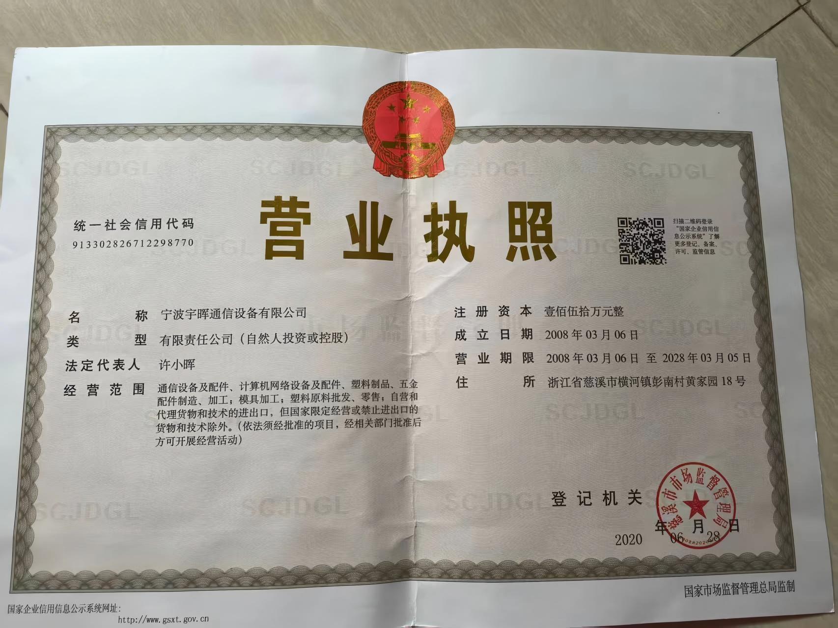 Имя сертификата: 宁波宇晖通信设备有限公司